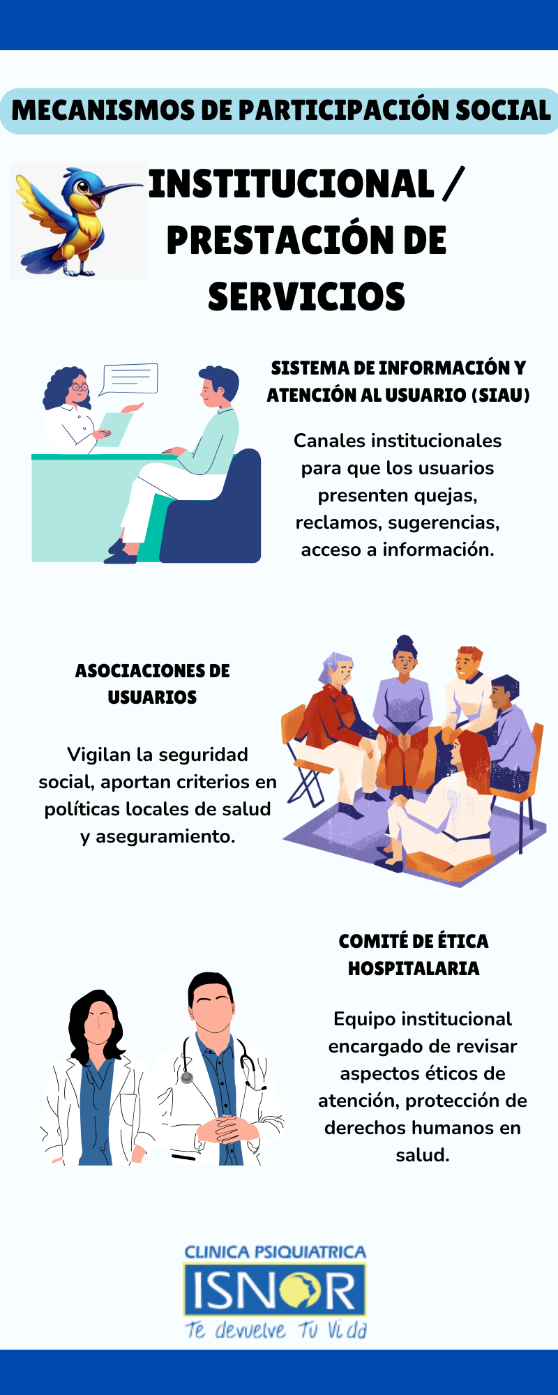 Las instituciones del Sistema General de Seguridad Social en Salud —EPS, IPS, entidades territoriales— deben garantizar que la participación ciudadana, social y comunitaria se ejerza en los ámbitos que les corresponda. Informar, capacitar y generar espacios accesibles para que los ciudadanos puedan participar y realizar rendición de cuentas ante la comunidad.